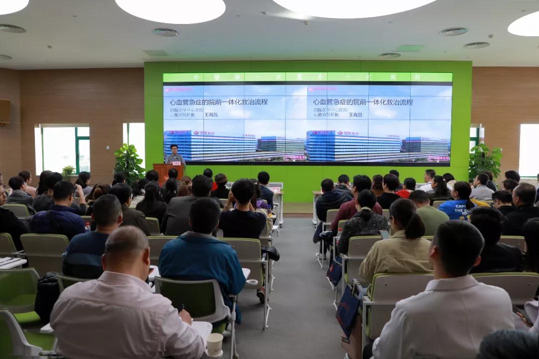 講座環(huán)節(jié),王海昌院長(zhǎng)就《心血管急癥的院前院內(nèi)一體化救治》進(jìn)行了詳細(xì)闡述,以大量數(shù)據(jù)強(qiáng)調(diào)了心血管疾病救治過(guò)程中把握時(shí)間窗的重要性,建議根據(jù)急性冠脈綜合征突發(fā)性、不可預(yù)測(cè)的特點(diǎn),建立完善的院前、院內(nèi)急救網(wǎng)絡(luò)、胸痛中心,協(xié)助120高速有效的運(yùn)轉(zhuǎn);潘僑主任為大家介紹了心梗伴室顫猝死的院前院內(nèi)救治,分析搶救成功的心肌梗死案例,講解了發(fā)生心跳驟?;颊咧?0-95%為心源性,心源性休克首選冠脈介入診療,院前及院內(nèi)急救早期、快速并完全地開(kāi)通梗死相關(guān)動(dòng)脈是改善患者預(yù)后的關(guān)鍵。