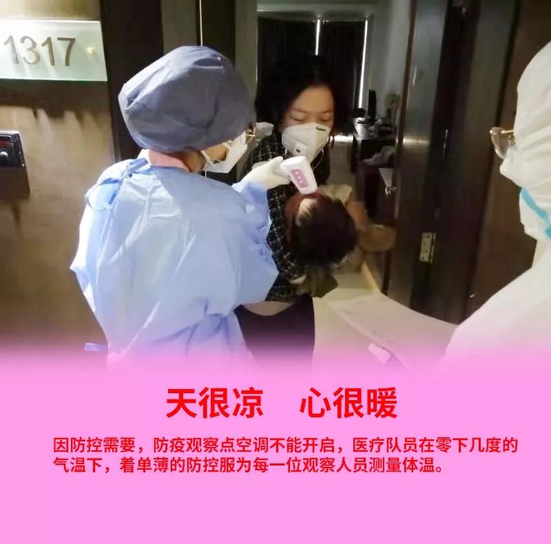 這支醫(yī)療隊(duì)由3名醫(yī)生、5名護(hù)士組成,分別是房武寧、張曉敏、王婧3位醫(yī)生;護(hù)士為白容容、陳蕓、王亞馨、燕瑞娥、田橋。身穿不透氣的防護(hù)服,醫(yī)護(hù)人員時(shí)時(shí)刻刻與時(shí)間拼耐心、與疫情變化拼細(xì)心。留觀人員中有16名70歲以上的老人,6名3歲以下的兒童。他們體質(zhì)較弱,需要更多的關(guān)懷與呵護(hù)。護(hù)士王亞馨每天要在樓上往返7、8趟為他們測體溫、安撫情緒?!拔乙矔r(shí)常想念家人,春節(jié)沒法和他們一起過年?,F(xiàn)在,這里的老人和孩子就是我的家人?!闭f著,豆大的汗珠順著她的眼睫毛滑落。即便超負(fù)荷工作著,她也從未喊過苦叫過累。