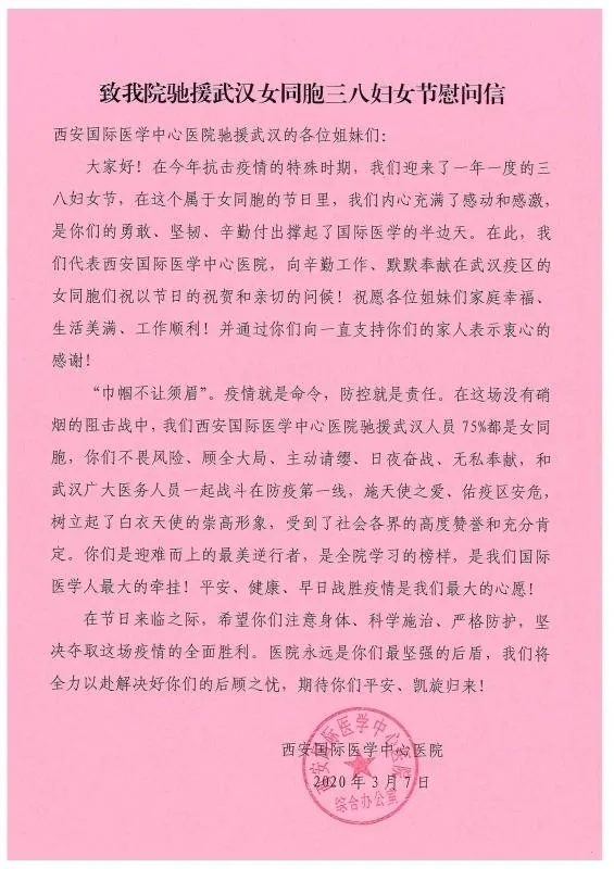 “疫”線有我,做“逆行先鋒”。疫情發(fā)生正值春節(jié)假期,西安國(guó)際醫(yī)學(xué)中心醫(yī)院從全面部署防控工作到建立聯(lián)防聯(lián)控工作機(jī)制,從醫(yī)療隊(duì)員火速馳援到醫(yī)療物資緊急保障,從正式進(jìn)駐武漢第八醫(yī)院和隨州市中心醫(yī)院到全面接收新冠患者……都有女隊(duì)員們不懼危險(xiǎn)、日夜奮戰(zhàn),同時(shí)間賽跑,與病魔較量的身影。2月2日,接陜西省衛(wèi)健委馳援武漢的指令,5個(gè)小時(shí),1000余名女醫(yī)護(hù)人員主動(dòng)請(qǐng)纓,遞交了請(qǐng)戰(zhàn)書、紅手印。腫瘤醫(yī)院副院長(zhǎng)薛妍教授、感控部主任劉冰、總護(hù)士長(zhǎng)倪曉慧等醫(yī)護(hù)人員舍小家、為大家,迅速出擊、臨危不懼,不計(jì)名利、不顧生死,于2月3日搭乘包機(jī)到達(dá)指定地點(diǎn),令人肅然起敬,令人敬佩感動(dòng)。