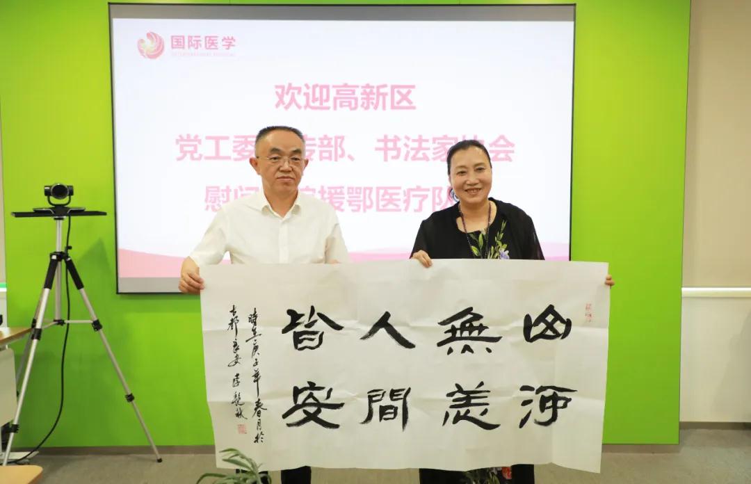 陜西省書協(xié)副主席、高新區(qū)書法家協(xié)會(huì)主席李艷秋,陜西省書協(xié)女書法家委員會(huì)委員、高新區(qū)書法家協(xié)會(huì)常務(wù)副主席兼秘書長(zhǎng)曹京梅,高新區(qū)書法家協(xié)會(huì)副主席王強(qiáng)、閆瑞、吳建軍以及書法家劉鵬飛、高瑞成、馮傳金、胡江濤、郭小和、段西漢等前來慰問。陜西省書協(xié)副主席李艷秋高度贊揚(yáng)了我院支援湖北醫(yī)療隊(duì),隊(duì)員們不辱使命、載譽(yù)而歸,以實(shí)際行動(dòng)詮釋了白衣天使的初心,是新時(shí)代最可愛的人。“醫(yī)者仁心”“人間大愛、可歌可頌”……一幅幅蒼勁有力的書法作品致敬白衣戰(zhàn)士,贊美之情躍然紙上。