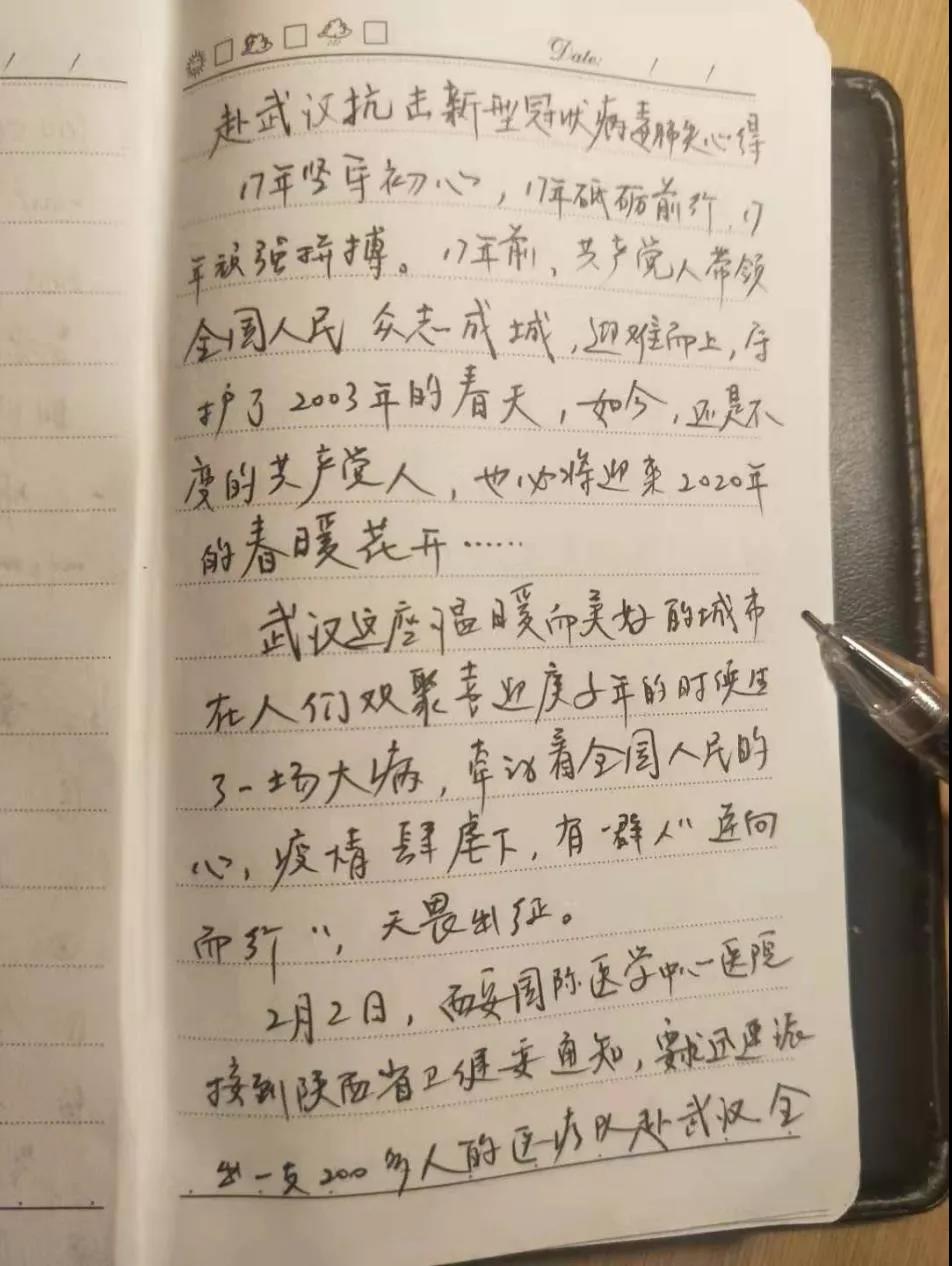 日記的作者李一鳴是西安國(guó)際醫(yī)學(xué)中心醫(yī)院消化內(nèi)科三病區(qū)的主治醫(yī)師,也是赴武漢醫(yī)療隊(duì)成員。提及初心,他在日記中寫到,不論是作為一名醫(yī)者、一名黨員還是一名中華人民共和國(guó)公民,他都責(zé)無(wú)旁貸應(yīng)該奔赴抗擊疫情的最前線,于是他在得知將要組織支援武漢的醫(yī)療隊(duì)后第一時(shí)間報(bào)名。