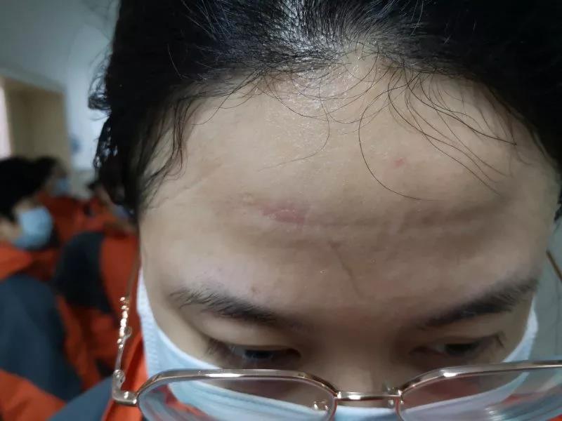 臉上的防護(hù)罩勒痕清晰可見,
