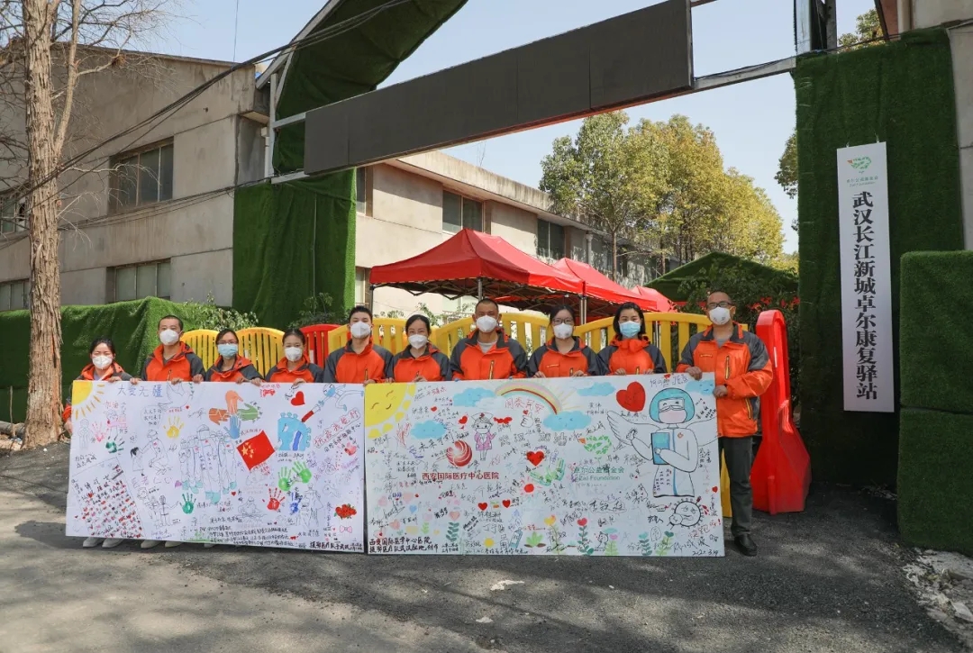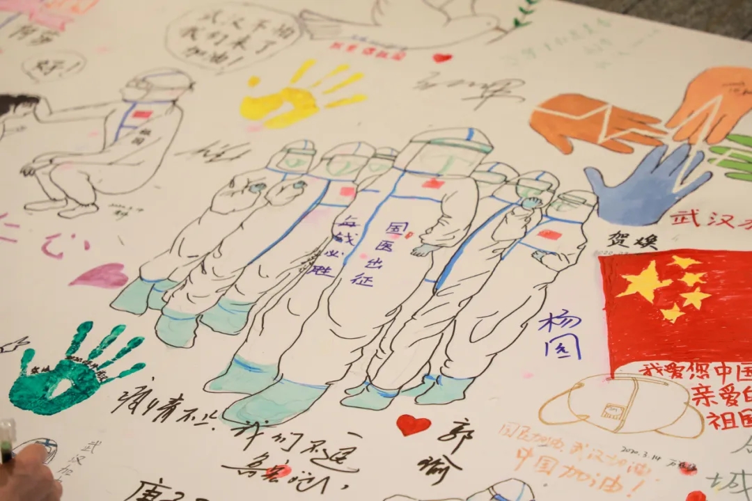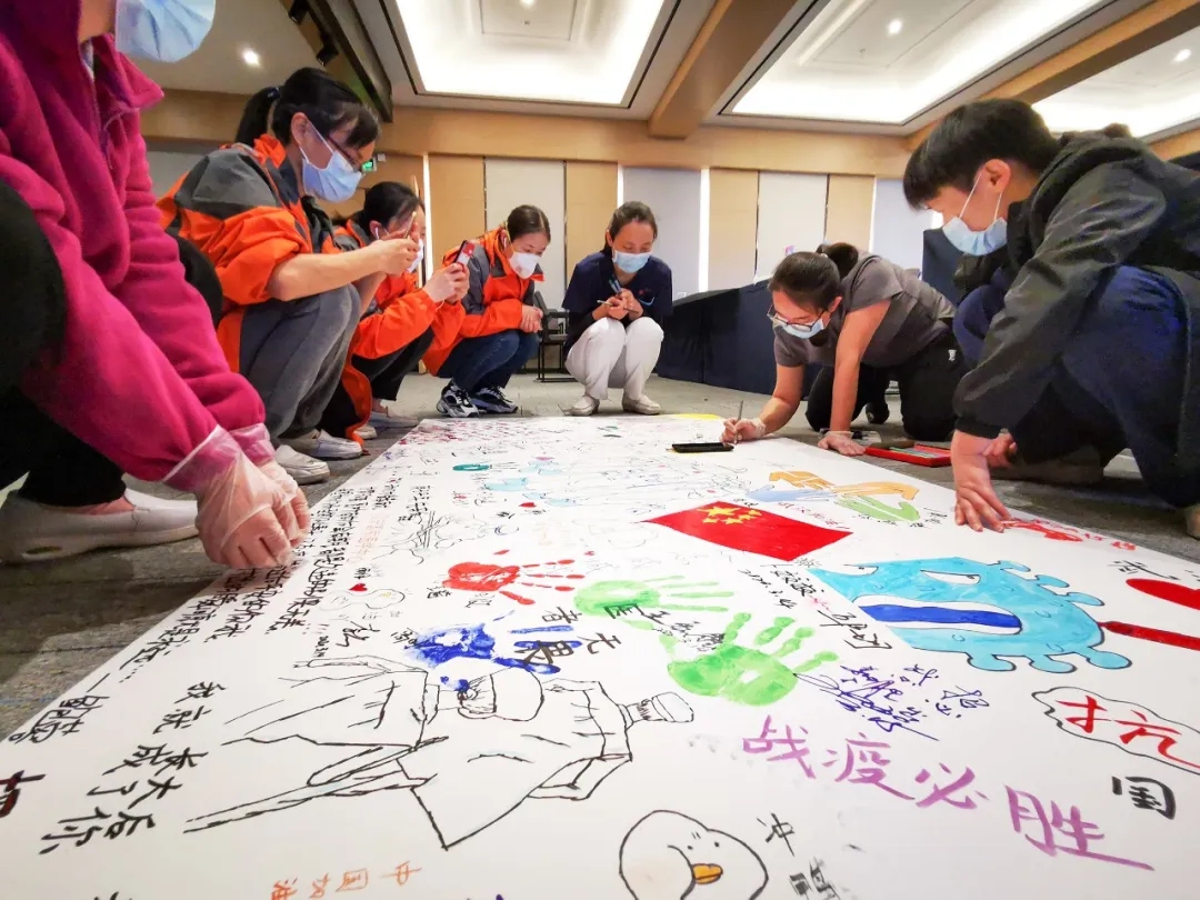 這兩幅畫(huà)板由醫(yī)療隊(duì)員和駐地的志愿者共同創(chuàng)作,一支支畫(huà)筆繪出全體人員戰(zhàn)“疫”祝福心聲:“武漢加油,中國(guó)必勝?!?/span>