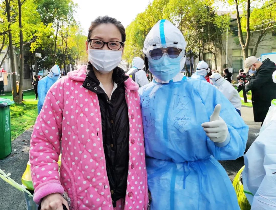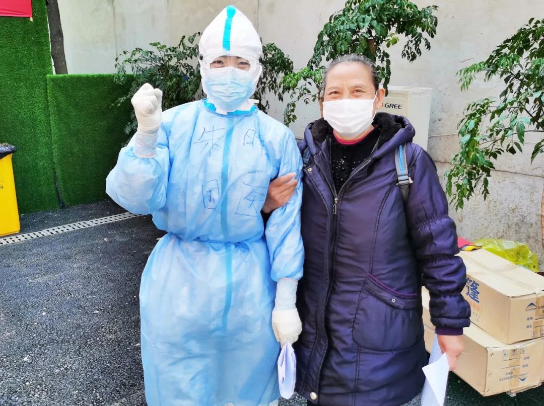 “阿姨你咋還不走呢?”護(hù)士長(zhǎng)朱晴看到一位“熟人 ”還站在驛站門口。這位阿姨的老伴兒感染新冠不幸去世,她和兒子都被傳染,從醫(yī)院到康復(fù)驛站后出現(xiàn)了嚴(yán)重應(yīng)激反應(yīng),失眠,哭泣,休息不好,血壓升高,胃口很差。除了關(guān)注阿姨的身體狀況外,朱晴時(shí)常寬慰她,要保重身體和兒子一起回家?!拔乙湍懔魝€(gè)照片,以后一定要去西安看你。當(dāng)面感謝你們醫(yī)療隊(duì)!”阿姨挽著朱晴的胳膊說(shuō)。