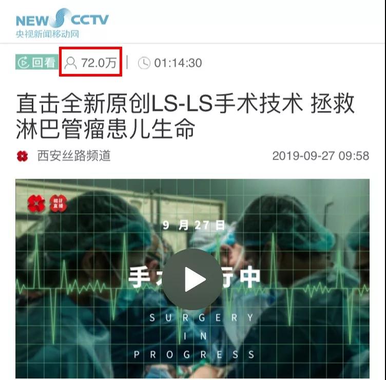 開(kāi)診后的第一個(gè)手術(shù)日,西安電視臺(tái)全程直播了全新原創(chuàng)LS-LS手術(shù)技術(shù)拯救淋巴管瘤患兒生命的手術(shù)過(guò)程!央視新聞移動(dòng)網(wǎng)、今日頭條客戶端、廣東廣播電視臺(tái)觸電新聞、西安網(wǎng)微博等同步播出西安國(guó)際醫(yī)學(xué)中心骨科醫(yī)院拯救淋巴管瘤患兒的全過(guò)程。據(jù)不完全統(tǒng)計(jì),在線觀看直播達(dá)百萬(wàn),僅央視新聞移動(dòng)網(wǎng)的觀看量達(dá)72萬(wàn)!