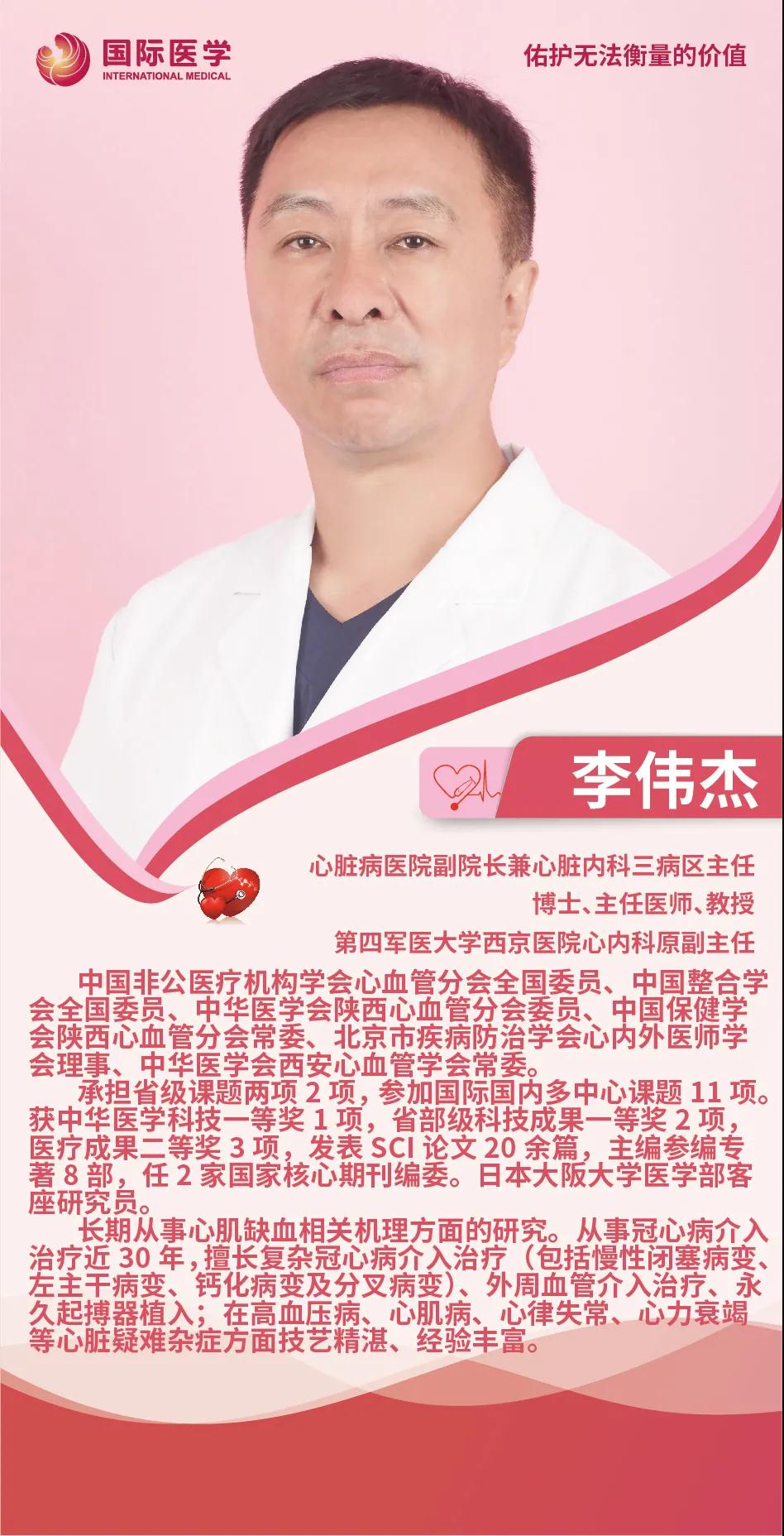 李偉杰,第四軍醫(yī)大學(xué)西京醫(yī)院心內(nèi)科原副主任,博士、主任醫(yī)師、教授。先后承擔(dān)了多項國際國內(nèi)及省部級課題,獲得過中華醫(yī)學(xué)科技一等獎等多重獎項,長期從事于血管管介入治療,擅長冠心病復(fù)雜病變的介入手術(shù)治療,包括慢性閉塞病變、左主干病變、鈣化病變及分叉病變,在外周血管的介入治療級其他心血管疾病的診療方面具有非常豐富的經(jīng)驗。李偉杰在西京醫(yī)院工作多年,掛號一票難求,因和藹可親的態(tài)度、精湛的醫(yī)技、崇厚的醫(yī)德獲得了一大批的患者“粉絲”,是患者口中的明星醫(yī)生,醫(yī)生口中的業(yè)界“男神”。