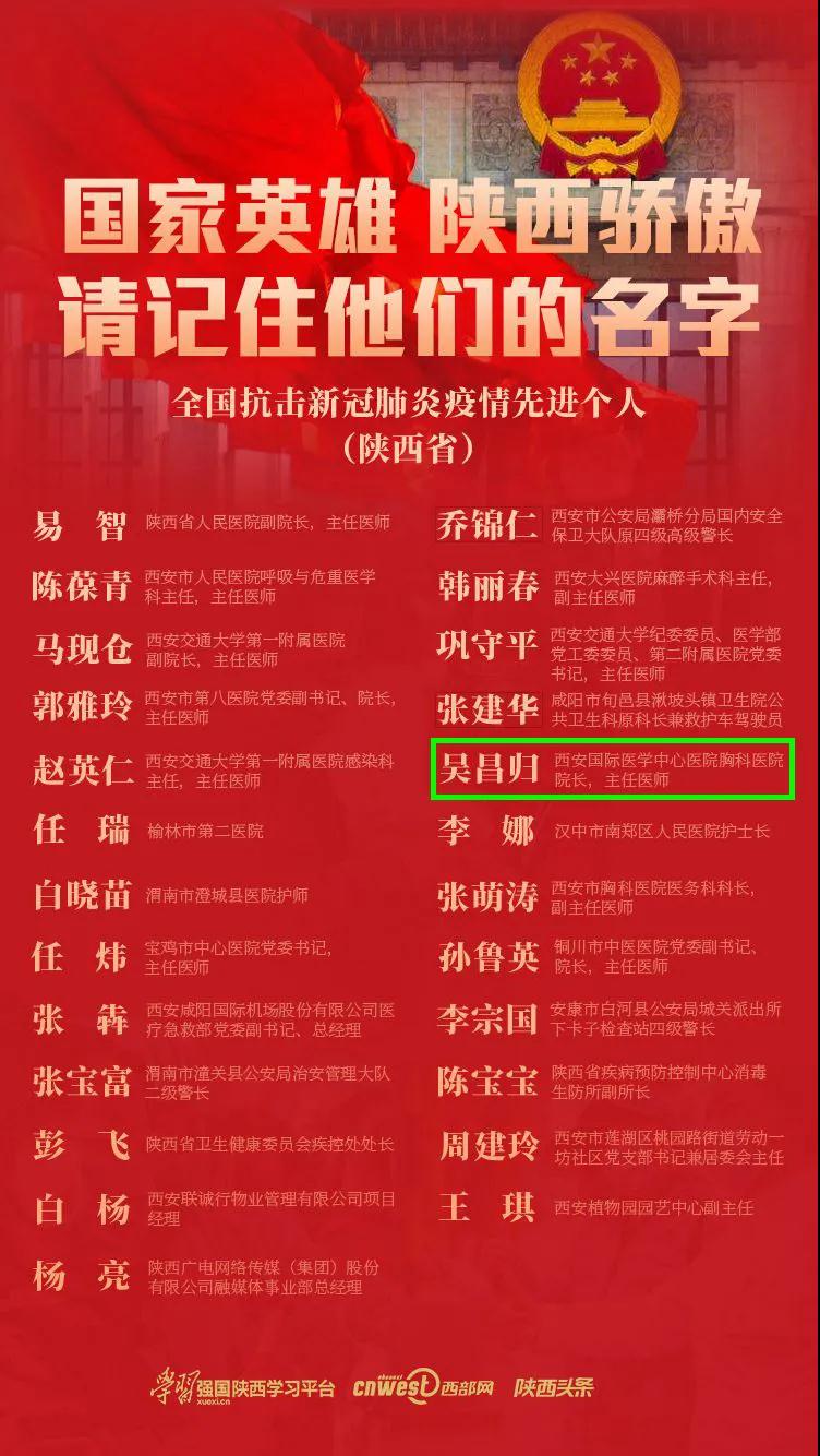 吳昌歸表示,受到黨和國(guó)家的表彰,聆聽(tīng)了總書記的講話,我非常激動(dòng)。這份榮譽(yù)不僅是對(duì)個(gè)人的褒獎(jiǎng),更是對(duì)西安國(guó)際醫(yī)學(xué)330名抗疫英雄的肯定!作為一名老軍人、老黨員、呼吸專業(yè)的老醫(yī)生,在這場(chǎng)戰(zhàn)疫中,我深深感受到了社會(huì)主義制度的無(wú)比優(yōu)越,真正感悟到“沒(méi)有共產(chǎn)黨就沒(méi)有新中國(guó)”的深刻內(nèi)涵。