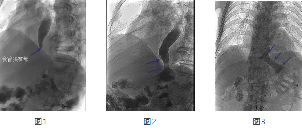 在韓國宏教授的帶領(lǐng)下,專家團隊經(jīng)多方面評估后,決定在DSA下為劉大爺行食管造影 食管支架置入術(shù)。術(shù)中透視可見食管中上段擴張明顯,食管下端賁門口明顯狹窄,造影劑淤積,呈線性緩慢進入胃腔(見圖1),經(jīng)過準(zhǔn)確定位后,釋放食管支架,再次造影可見造影劑經(jīng)支架順利進入胃腔(見圖2)。2天后再次造影見食管支架完全打開,位置正常,造影劑可順利通過支架(見圖3)。