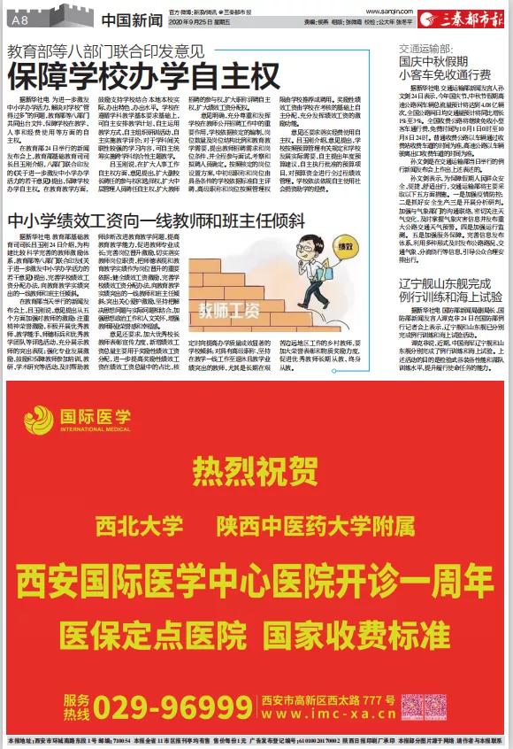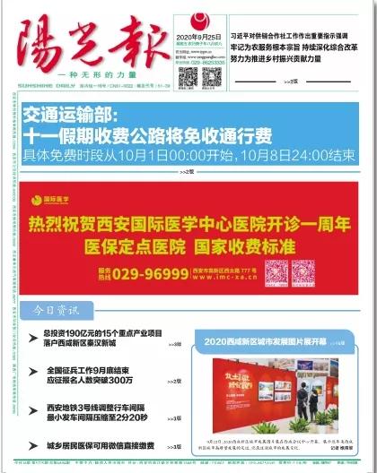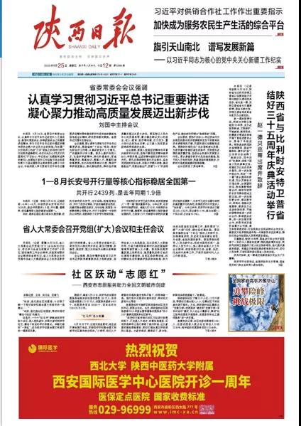 2020年9月25日,在西安國際醫(yī)學中心醫(yī)院一周歲生日之際,陜西日報、西安晚報、華商報、三秦都市報、陽光報分別刊文送上生日祝福。