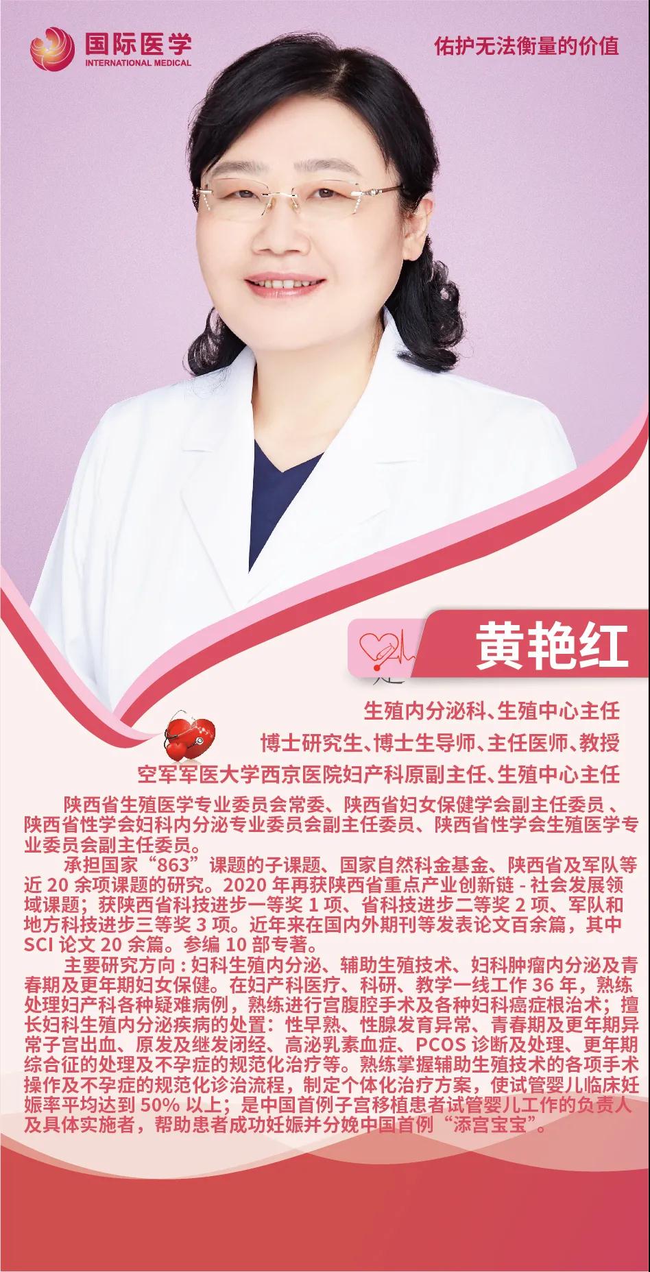 黃艷紅,西安國際醫(yī)學(xué)中心醫(yī)院生殖內(nèi)分泌科主任,醫(yī)學(xué)博士、博士生導(dǎo)師、主任醫(yī)師、教授,第四軍醫(yī)大學(xué)西京醫(yī)院婦產(chǎn)科原副主任、生殖醫(yī)學(xué)中心主任,陜西省生殖醫(yī)學(xué)專業(yè)委員會常委,陜西省婦女保健學(xué)會副主任委員,陜西省性學(xué)會婦科內(nèi)分泌專業(yè)委員會副主任委員,陜西省性學(xué)會生殖醫(yī)學(xué)專業(yè)委員會副主任委員。