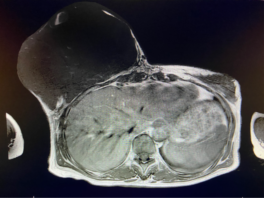 該患者右乳巨大腫物術(shù)前初步考慮乳腺葉狀腫瘤可能,因腫瘤太大,幾乎遍及整個(gè)右側(cè)乳房,為保證“無瘤原則”,術(shù)中切除范圍位置未知,極有可能出現(xiàn)皮瓣缺損。于是,經(jīng)過和整形醫(yī)院郭樹忠院長、整形外科王愛武主任的討論,提供了兩種手術(shù)方式,一是創(chuàng)面修復(fù)(植皮或轉(zhuǎn)移皮瓣修復(fù)創(chuàng)面),二是乳房再造,與患者及家屬溝通后,決定先解決腫物,3年病情不再復(fù)發(fā)后,可以再考慮乳房重建。