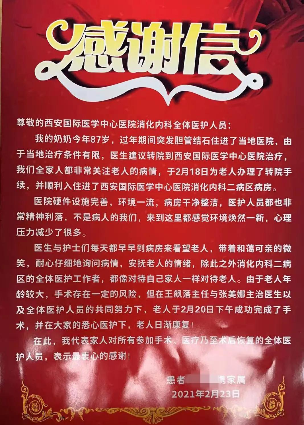 “醫(yī)生與護(hù)士們每天都早早到病房看望老人,耐心仔細(xì)詢(xún)問(wèn)病情,安撫老人情緒……我代表家人對(duì)全體醫(yī)護(hù)人員表示最衷心的感謝!”出院當(dāng)天,岳奶奶的兒女將感謝信與錦旗送到消化內(nèi)科二病區(qū)醫(yī)護(hù)人員手中。