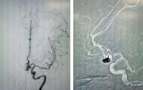 腦血管較外周血管更為脆弱、迂曲,對術(shù)者的操作技術(shù)及精準性要求特別高。術(shù)中,陸丹醫(yī)生通過股動脈穿刺、置入微導管,再通過微導管將彈簧圏送入動脈瘤腔內(nèi),利用彈簧圈的機械閉塞作用,達到防止動脈瘤破裂的目的。術(shù)后,患者各項生命體征平穩(wěn)。