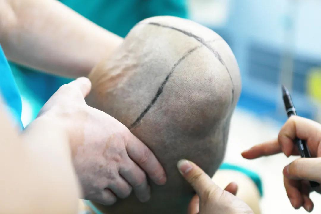 由于患者腫瘤供血非常豐富,異常血管穿插在腫瘤侵蝕的顱骨內,為保證達到手術預期目的,手術只能一步步小心前進,經(jīng)歷17個小時,輸血達13000毫升,賀世明主任用耐心、細心的精準操作,對腫瘤進行了完全切除。隨后,整形醫(yī)院醫(yī)生對患者頭部頭皮進行了皮瓣設計與縫合。