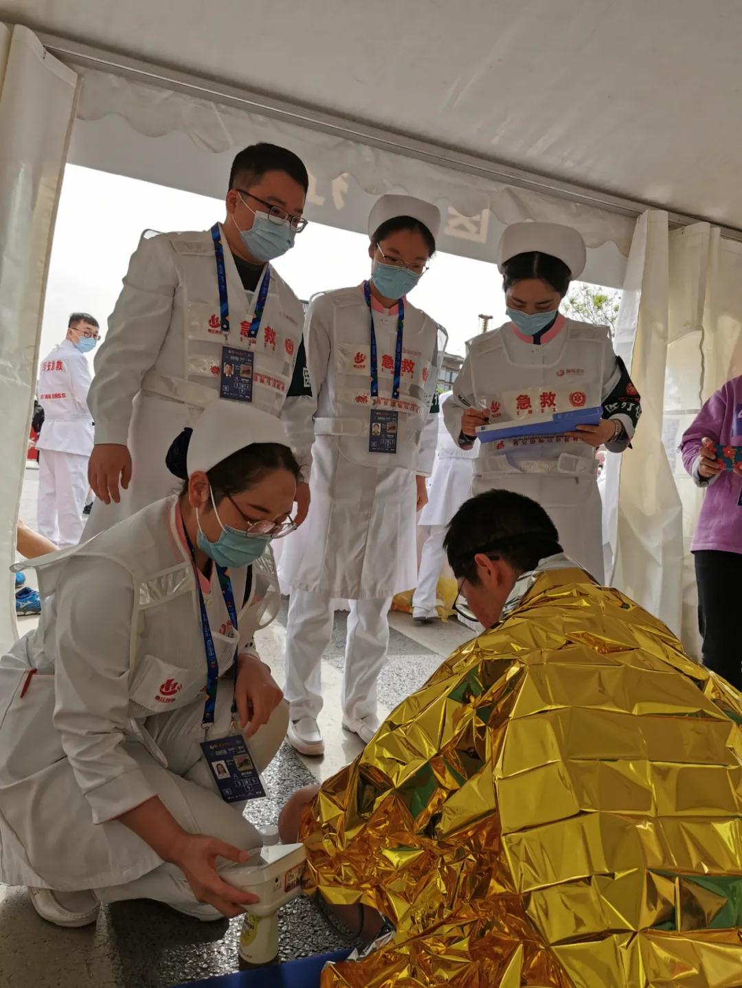 “醫(yī)生,我扭傷了腳踝,麻煩幫忙看看”,“護士,麻煩噴一些運動冰肌噴”……9點開始,奔跑大軍陸續(xù)抵達,涂抹凡士林、提供糖鹽水、處理扭傷抽筋等醫(yī)療需求均得到回應,醫(yī)護人員各司其職,對運動員開展巡回指導和賽后恢復工作。