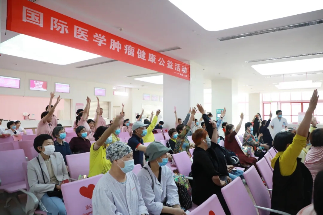 腫瘤一病區(qū)的醫(yī)護(hù)人員和志愿者們共同演練了一段八段錦,隨后的健康知識(shí)問(wèn)答和歌曲快閃環(huán)節(jié)將活動(dòng)氛圍推向高潮,大家爭(zhēng)先恐后地舉手搶答,現(xiàn)場(chǎng)問(wèn)答也促進(jìn)了對(duì)于腫瘤防治、康復(fù)知識(shí)的推廣。最后,大家合唱歌曲“相信我們會(huì)創(chuàng)造奇跡”,積極、歡樂(lè)的氛圍縈繞不息?;顒?dòng)最后,薛妍副院長(zhǎng)、劉樹(shù)松教授和張俊美醫(yī)生對(duì)患者的提問(wèn)進(jìn)行了耐心、細(xì)致的解答。
