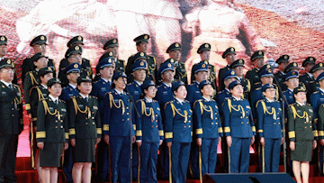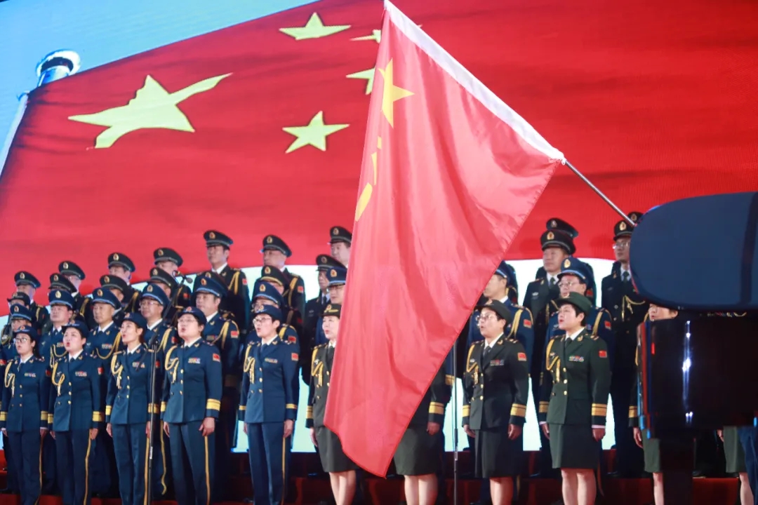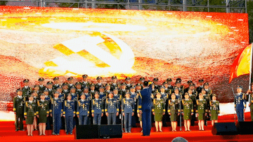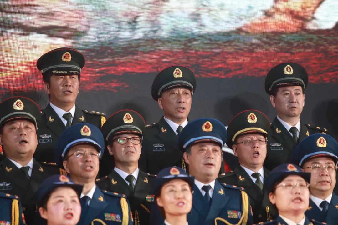“我是一個兵,來自老百姓……”合唱將《我是一個兵》《沒有共產(chǎn)黨就沒有新中國》巧妙編排在一起?!段沂且粋€兵》鏗鏘有力,氣勢高亢,展示了老兵們永不褪色的軍人風(fēng)采;隨著中國人民解放軍進行曲響起,三名軍旗手,邁著堅實的步伐走上舞臺;“沒有共產(chǎn)黨就沒有新中國,沒有共產(chǎn)黨就沒有新中國……”激情高昂的歌聲表達出每一個人的心聲,合唱融入了京劇唱法,男聲鏗鏘有力,氣勢十足,女聲委婉細(xì)膩,優(yōu)美動聽,極富有感染力,將整場氣氛推向高潮,贏得全場陣陣掌聲。