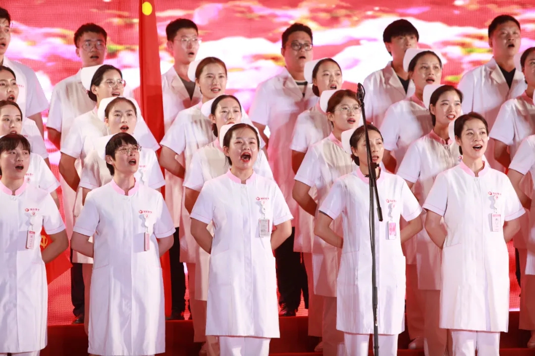 “夜半三更喲盼天明,寒冬臘月喲盼春風(fēng)……”合唱團用歌聲抒發(fā)對偉大祖國的深深至愛,傾訴對醫(yī)學(xué)事業(yè)的拳拳之情。在領(lǐng)唱的帶領(lǐng)下,大家分男女聲部進行輪唱,群情激昂,歌聲嘹亮。在全場的掌聲中,大家揮舞起手中的黨旗,抒發(fā)對祖國的熱愛。