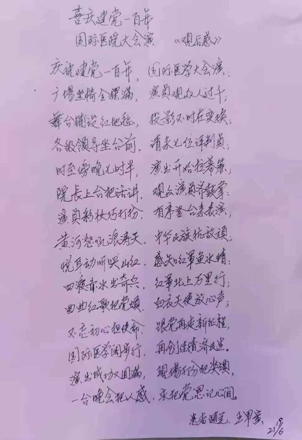 “曲曲紅歌把黨頌,白衣天使放心聲;不忘初心擔(dān)使命,跟黨再走新征程;國際醫(yī)學(xué)闊步行,再創(chuàng)佳績濟民生……” 一位患者在觀看演出后,深情寫下這首《觀后感》,為西安國際醫(yī)學(xué)中心醫(yī)院點贊。