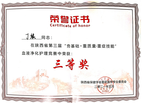 2021年5月,陜西省保健學(xué)會重癥醫(yī)學(xué)專業(yè)委員會舉辦了第三屆《“夯基礎(chǔ)?重質(zhì)量-重癥技能”血液凈化護(hù)理技能競賽》。丁緣經(jīng)過激烈角逐,從陜西省21家醫(yī)院的24名選手中脫穎而出,榮獲三等獎,拿到了全國聯(lián)賽的入場券。