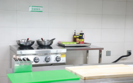 在“愛心廚房”我們發(fā)現(xiàn),廚房配備了廚具、電器設(shè)備、鍋碗瓢盆,常用調(diào)料等。