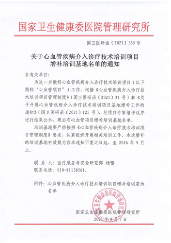 9月7日,在國家衛(wèi)生健康委醫(yī)院管理研究所發(fā)布的《關于心血管疾病介入診療技術培訓項目增補培訓基地名單的通知》中,西安國際醫(yī)學中心醫(yī)院榜上有名,這標志著我院已成功躋身于國家級心血管疾病介入診療醫(yī)療機構行列,同時也標志著我院成為陜西省冠心病介入培訓基地之一,肩負心血管介入醫(yī)師的規(guī)范化培訓的使命,造福更多的心血管疾病患者。