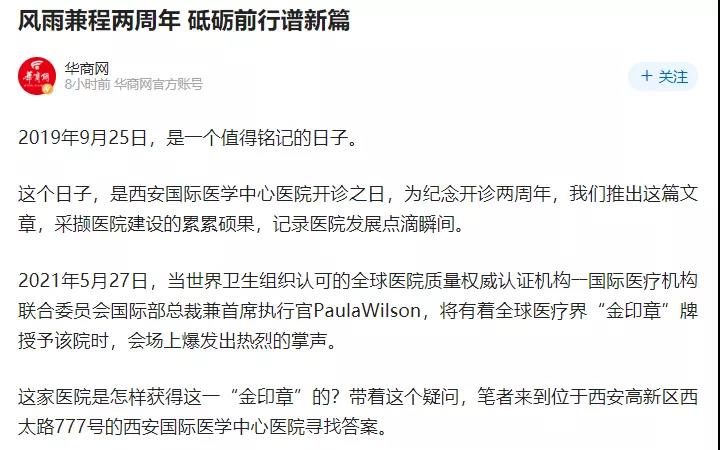 今日《華商報》A8版用整版的篇幅刊登了《風(fēng)雨兼程兩周年 砥礪前行譜新篇——西安國際醫(yī)學(xué)中心醫(yī)院提升醫(yī)療品質(zhì)紀(jì)實》。華商報以圖文并茂的形式記錄了醫(yī)院建設(shè)的點滴瞬間,全方位、多角度報道了醫(yī)院兩年來的發(fā)展碩果。