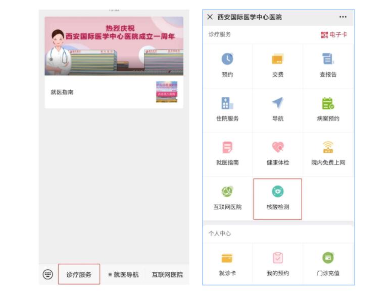 醫(yī)院核酸檢測(cè)已開通線上預(yù)約,大家可通過(guò)“西安國(guó)際醫(yī)學(xué)中心醫(yī)院服務(wù)號(hào)”微信公眾號(hào)進(jìn)行預(yù)約。