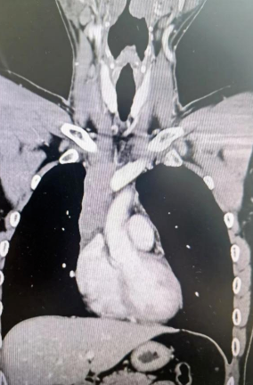 經(jīng)檢查發(fā)現(xiàn)患者前上縱隔腫瘤已經(jīng)完全侵犯了我們?nèi)梭w最主要的大靜脈之一——上腔靜脈,導(dǎo)致上腔靜脈回流嚴(yán)重受阻并導(dǎo)致由上腔靜脈起至左側(cè)無名靜脈、右側(cè)鎖骨下靜脈、右側(cè)頸內(nèi)靜脈等多根自上往下回流的靜脈阻塞,從而形成了廣泛的栓子,牢牢堵住了要流回心臟的血流,只能靠別的一些側(cè)支循環(huán)超負(fù)荷的工作,這也就是為什么孫先生脖子甚至是頭都明顯腫起來的原因。
