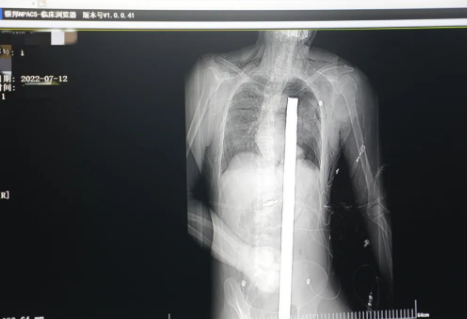情況緊急!術(shù)中探查后發(fā)現(xiàn),長120cm直徑3cm的螺紋鋼經(jīng)患者右側(cè)會(huì)陰部穿入,傷及直腸,途徑膀胱后方,左側(cè)髂總動(dòng)靜脈之間傷及左腎后,經(jīng)胰腺后方在肝脾之間穿破膈肌,在下肺靜脈前方穿入左肺穿破氣管及左右主支氣管膜部,止于主動(dòng)脈弓下水平,穿入體內(nèi)的部分達(dá)到75cm。
