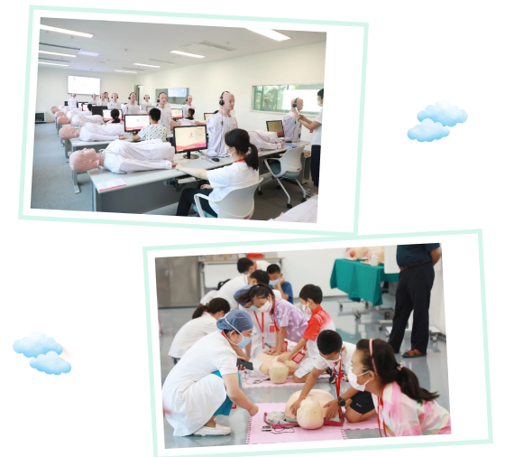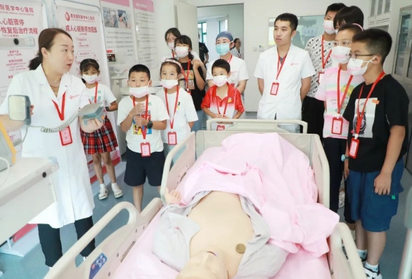 在培訓(xùn)中心,醫(yī)護(hù)人員為小朋友們講解急救知識(shí)、心肺檢查及手術(shù)科普知識(shí)?!叭绻瑢W(xué)摔傷、暈倒、停止呼吸怎么辦呢?”醫(yī)生示范,教會(huì)大家如何正確地現(xiàn)場(chǎng)救助。
