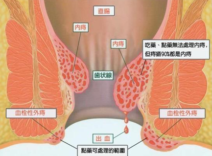 1.痔瘡便血 危害表現(xiàn)為便血、滴血,以及嚴重的噴血將導(dǎo)致頭暈、貧血等。