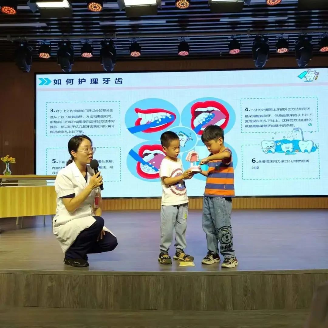 孩子們在臺下認真聽講,舉手發(fā)言,在輕松愉悅的氛圍中懂得怎樣愛牙護牙。