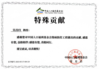 呼吸病藥物研究專委會一直高度重視呼吸慢病防控,鑒于吳昌歸院長對呼吸慢病防控所做的貢獻(xiàn),中國人口福利基金會授予吳昌歸院長慢病防控工程“特殊貢獻(xiàn)獎(jiǎng)”。