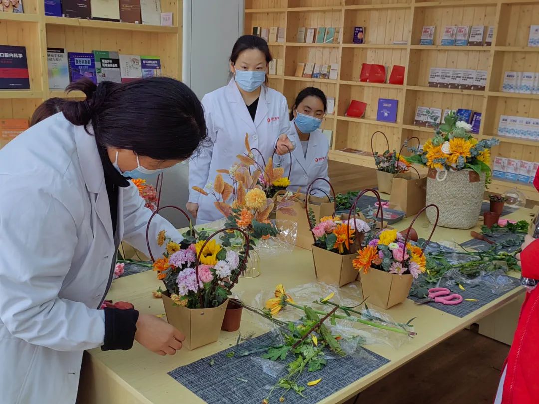 在插花過程中,每個(gè)人臉上都洋溢著幸??鞓返男θ?,在插花勞作中尋找樂趣,從作品欣賞中獲得滿足,在相互交流中拉近距離。五顏六色的花材在大家手中被賦予了新的生命和寓意,呈現(xiàn)出一件件清新怡人的花藝作品。此刻,無論媽媽、妻子、女兒,還是醫(yī)生、護(hù)士,雖然角色不一樣,但都沉浸在專注花藝的體驗(yàn)中。