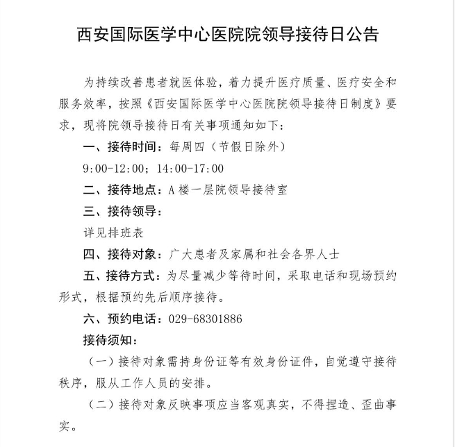 西安國際醫(yī)學中心醫(yī)院院領導接待日公告