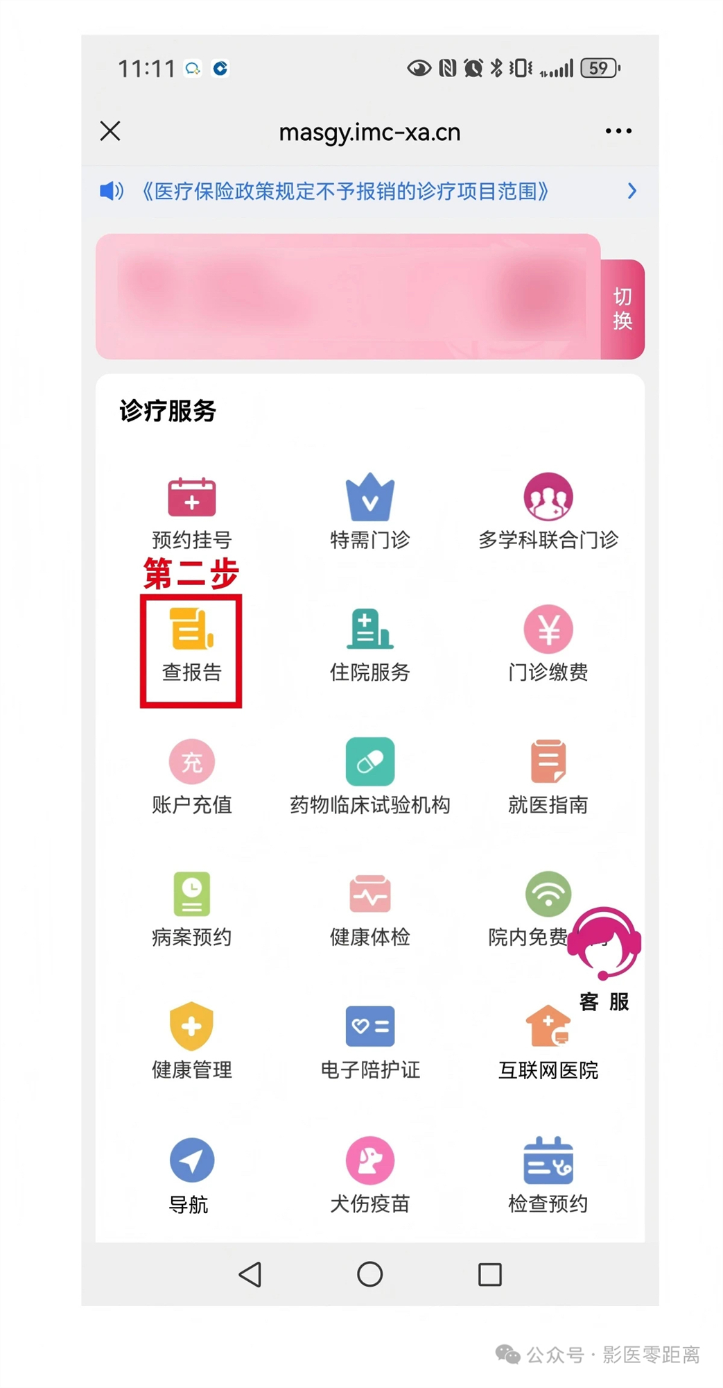 第一步:在醫(yī)院微信公眾號(hào)首頁,點(diǎn)擊底部菜單欄左側(cè)的【診療服務(wù)】入口